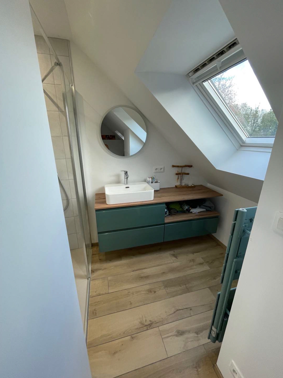 - a l'étage : palier mezzanine, wc avec lave-mains, chambre avec salle d'eau, chambre avec placard.