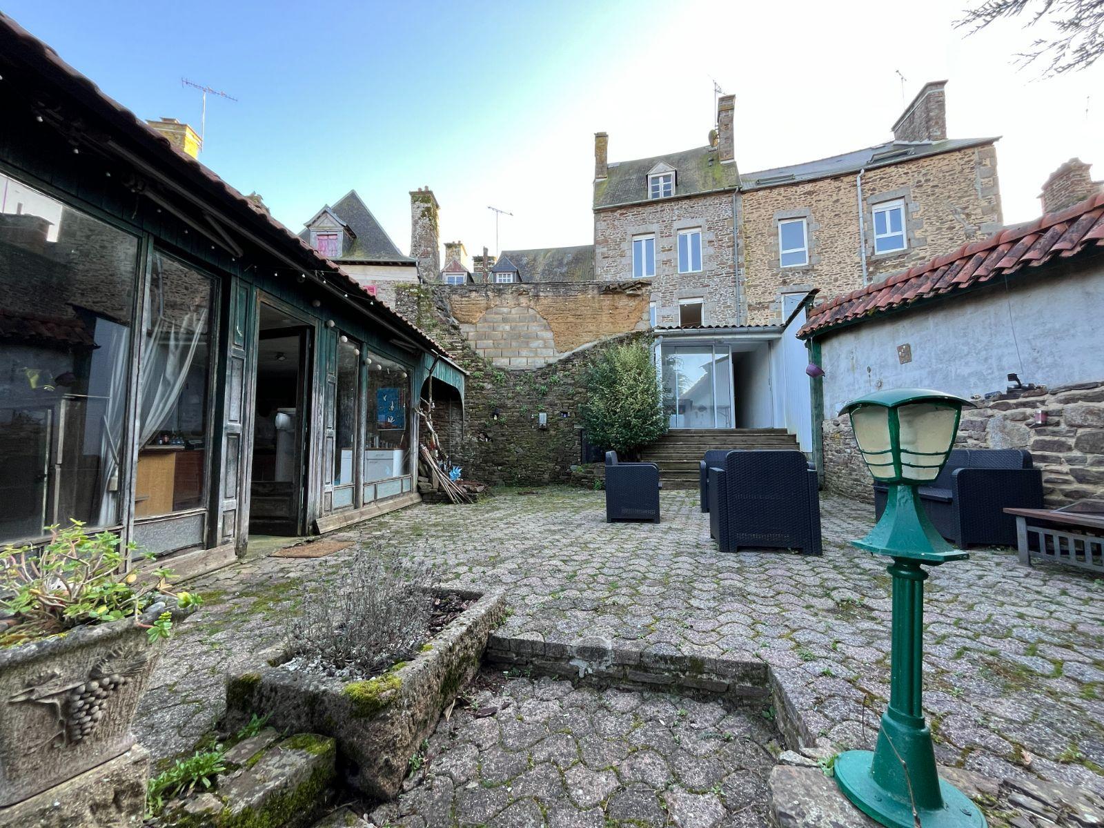 Situé au coeur de Saint James, à l'abri des regards côté jardin avec une vue imprenable sur la campagne environnante ; immeuble de rapport comprenant : Au rez-de-chaussée : un local commercial indépendant actuellement loué, un couloir distribuant buanderie, bureau et l'accès au jardin. Au premier étage : appartement composé d'une mezzanine, cuisine aménagée, séjour/salon et remise. Au second étage : trois chambres, salle de bains et dressing. Au dernier étage : grenier isolé avec chambre d'appoint. Terrasse avec cuisine d'été, abri, jardin clos de mur et atelier avec cave.