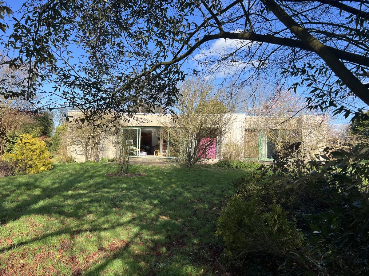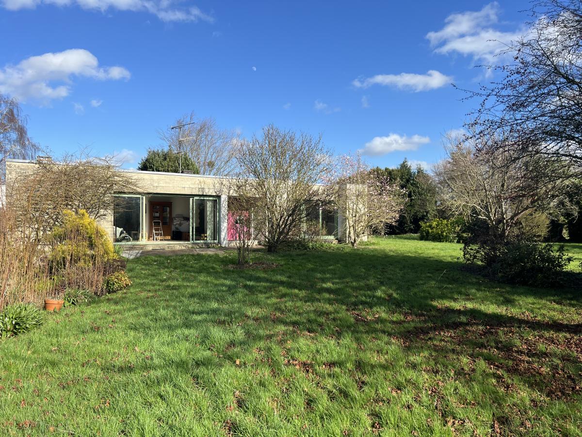 BIEVILLE BEUVILLE - CAEN nord bus de ville - HORS LOTISSEMENT - Atypique maison d'architecte de plain pied de 166 m2, comprenant entrée, séjour salon avec cheminée 46 m2, cuisine, 5 chambres dont une avec salle de bains, 2 salles d'eau, bureau, arrière cuisine, wc. Garage attenant de 40 m2. Double garage en annexe. Terrain 3800 m2. Travaux à prévoir. DPE : F