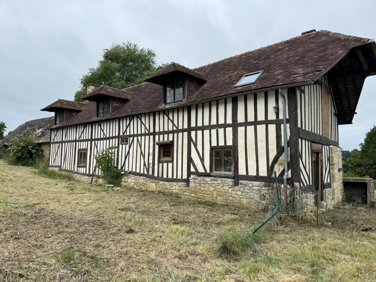 LISIEUX Très proche Propriété à rénover avec terrain de 1,3ha en partie constructible: Maison de 130m² + 50m² de débarras: RDC: cuisine, séjour-salon de 47m² avec cheminée, cave-chaufferie et dans le prolongement débarras. Etage: couloir, 2 chambres, 2 petites chambres, salle de bains et wc. Hangar de 380m²