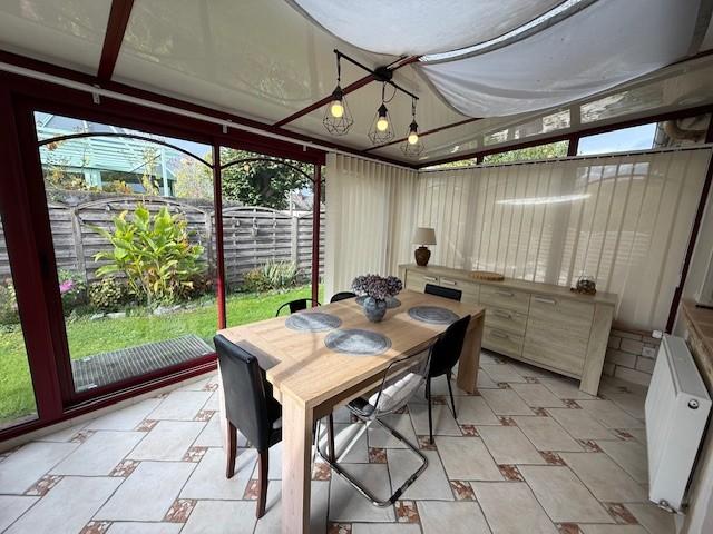 - Au rdc : entrée, vestiaire, wc indépendant, salle-salon, véranda chauffée de 16m², cuisine aménagée et équipée, buanderie avec grenier au-dessus, couloir, salle d'eau, bureau ou chambre, chambre, penderie, pièce à usage de chaufferie à granulés et salle de détente, chambre avec dressing, garage atelier d'environ 40m².