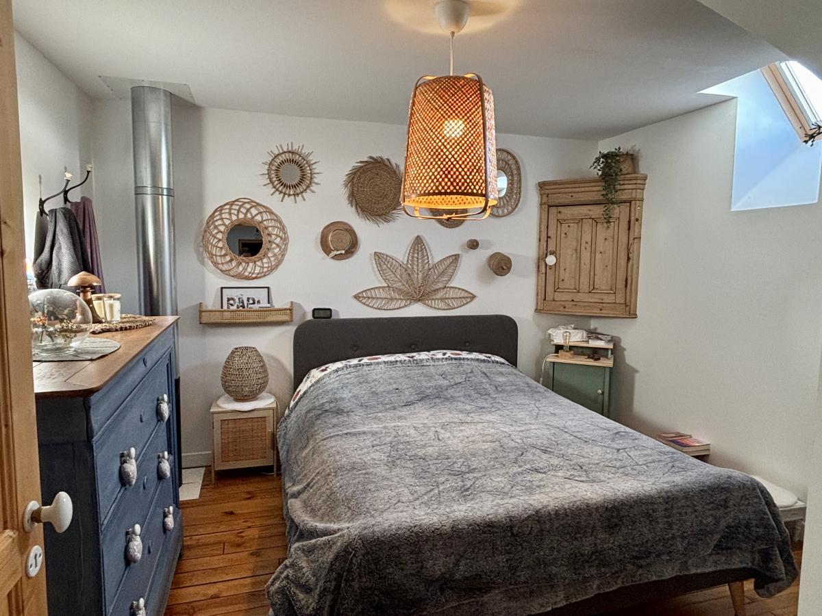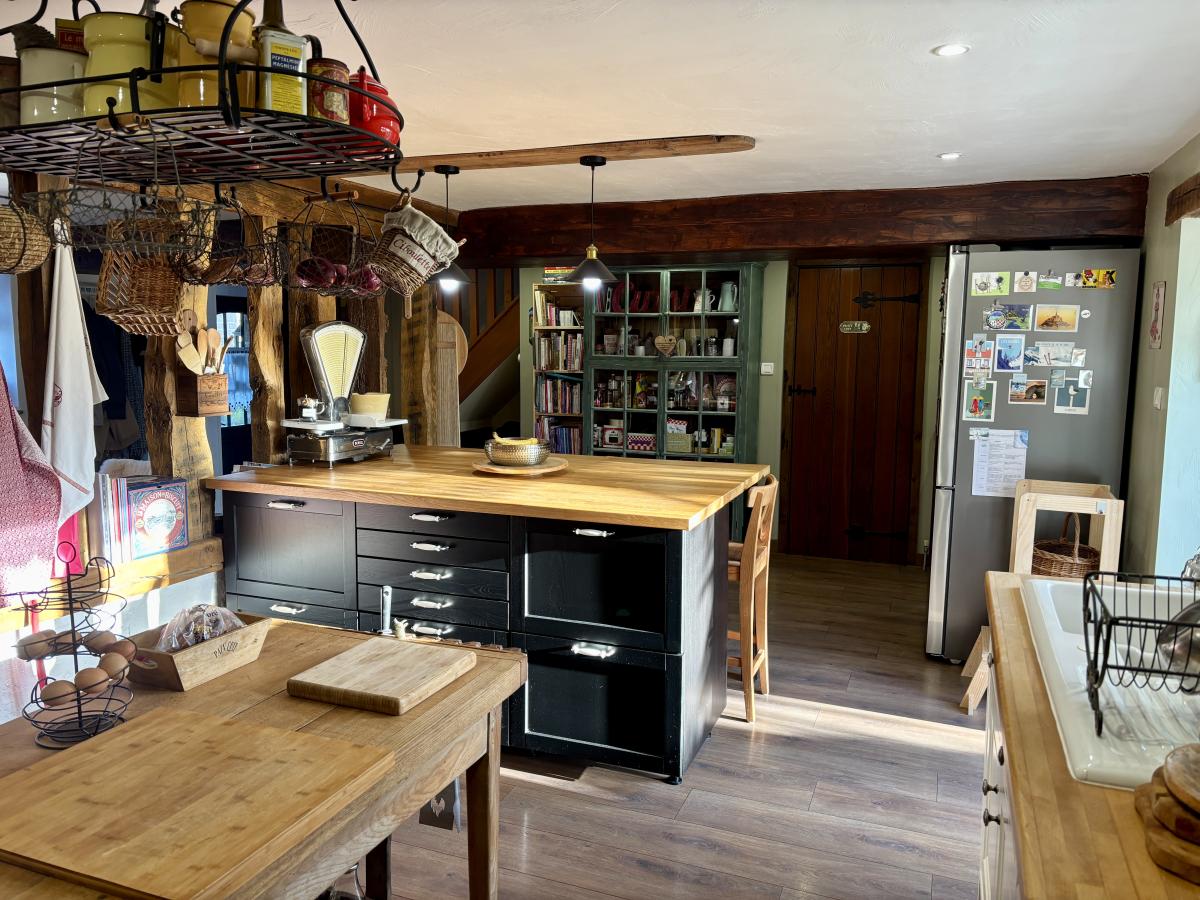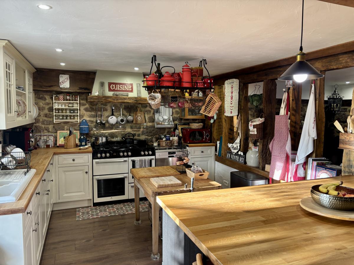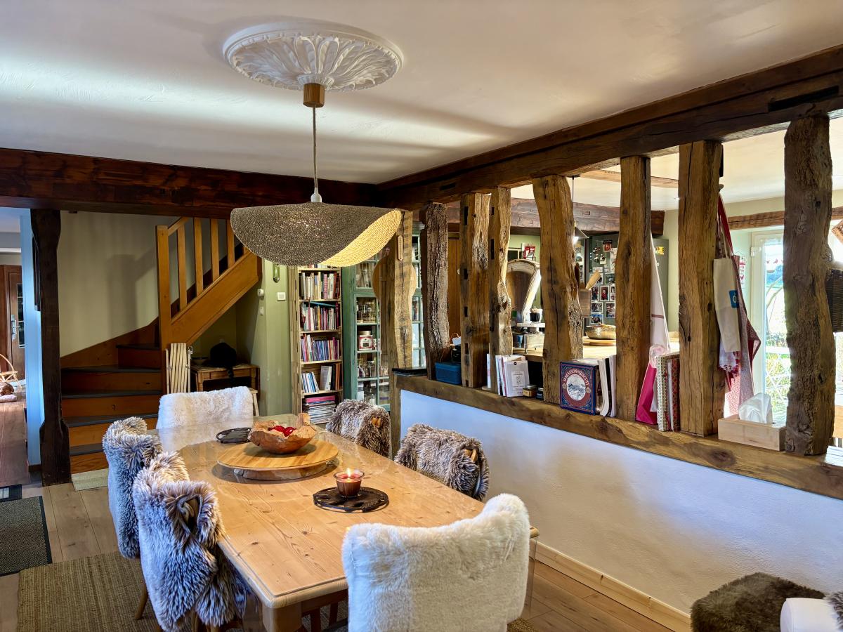 - Au rez-de-chaussée : un porche d’entrée, un salon chaleureux avec poêle à bois, une grande cuisine conviviale, une vaste pièce de vie lumineuse regroupant salon et salle à manger et un autre poêle, WC, cellier et chaufferie.