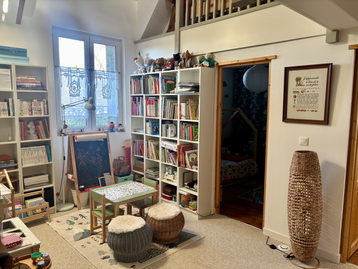 - À l’étage : un palier-bibliothèque desservant quatre belles chambres et une salle de bains avec douche et WC.