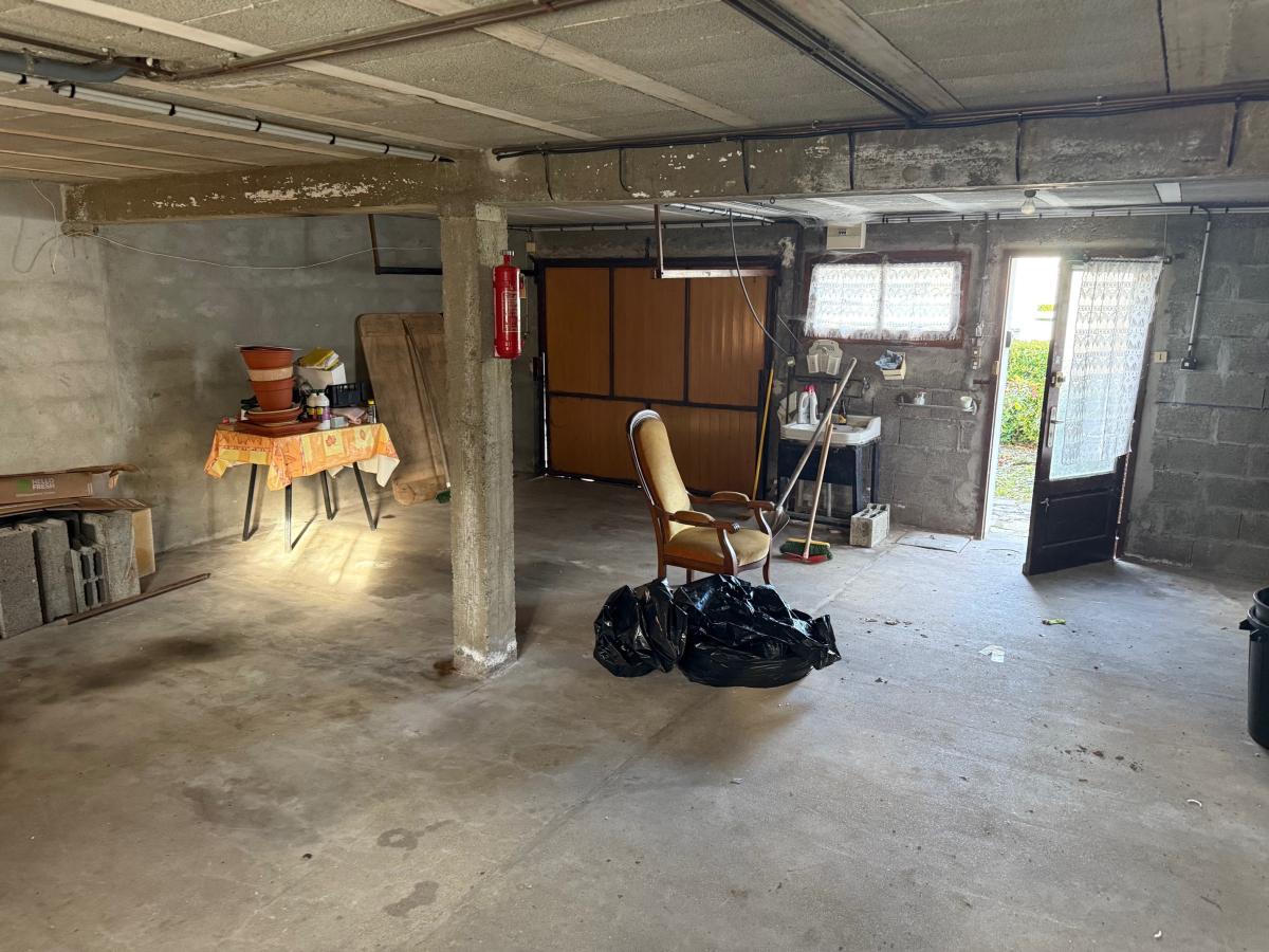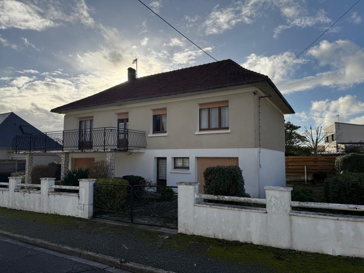 Saint Martin de Bréhal, dans quartier calme, A seulement environ 600 m de la plage et des commerces Maison des années 70 avec charpente métallique, comprenant : Rez-de-chaussée : deux garages, atelier, buanderie ; Etage : entrée, cuisine donnant sur la terrasse, séjour salon (conduit de cheminée) avec accès sur la terrasse, dégagement, trois chambres, salle de bains, WC ; Grenier avec possibilité. Cour et jardin.