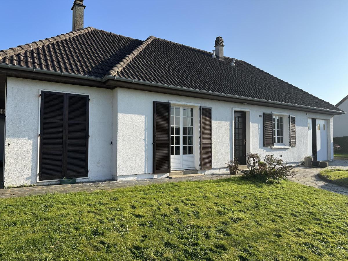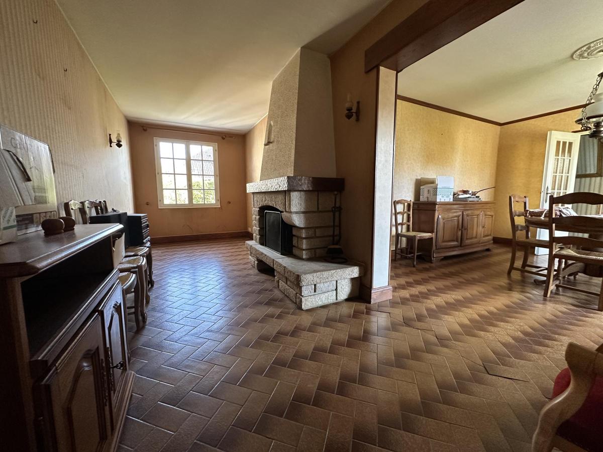 Maion comprenant une entrée, une cuisine, un séjour, un salon avec cheminée, trois chambres, une salle de bains et un WC.