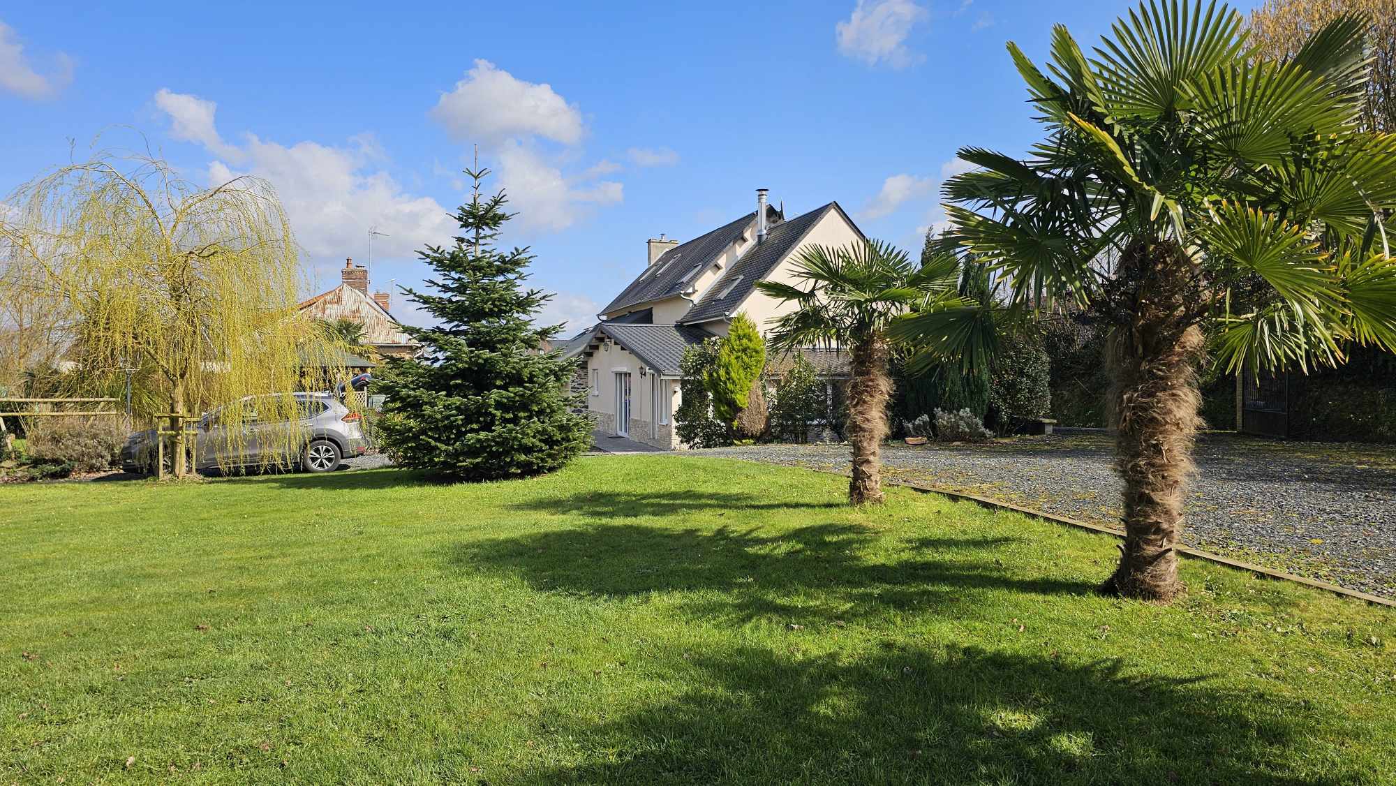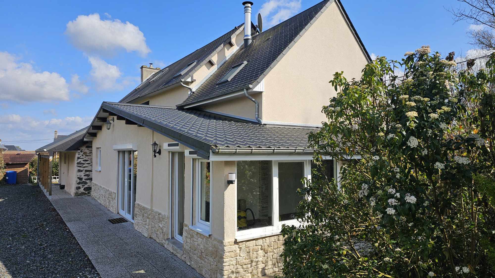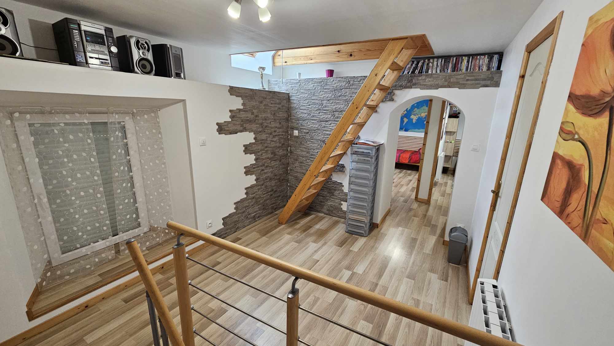 ne maison à usage d'habitation, comprenant : un séjour avec poêle à bois et coin bar, espace à finir d'aménager (cuisine), dégagement avec placards et wc, bureau, salon avec cheminée, cuisine, salle de bains avec wc. - à l'étage : couloir desservant une chambre avec placard, petite pièce, wc et salle d'eau, grande mezzanine. Sur autre partie à l'étage : mezzanine avec salle d'eau et wc, deux chambres avec placards. Jardin avec arbres fruitiers, dépendances, kiosque, poulailler. Px honor. inclus 5,17% (300.000€ NV + 15.500 € HN) ch. acq.