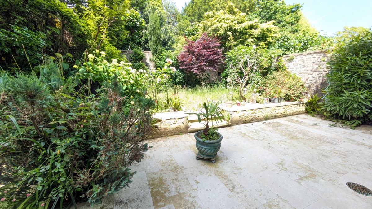 Terrasse et pelouse sur l'arrière, terrain clos de murs.