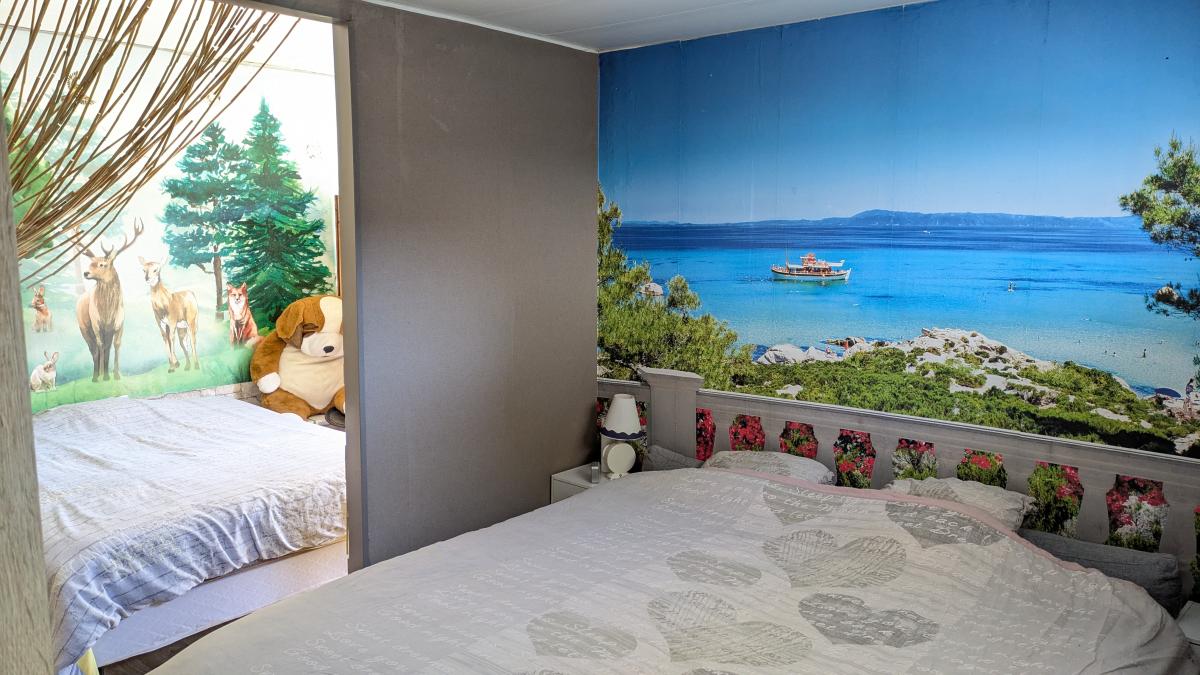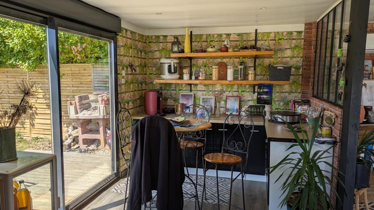 LOGEMENT : entrée, cuisine semi-ouverte, salle/salon avec poêle à granulés, W.C. avec lave-mains, salle de bains : double vasque, baignoire, douche, 1ère chambre, 2ème chambre. Terrasse.
