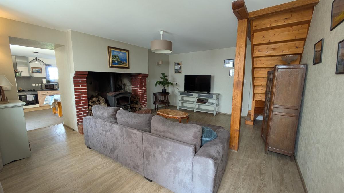 - Une grande cuisine aménagée et équipée, un salon avec une cheminée équipée d'un poêle à bois, salle d'eau, W.C. - Véranda - Au dessus : 2 chambres. - En perpendiculaire et de PLAN PIED : une salle de jeux, une chambre, une salle d'eau et un W.C.