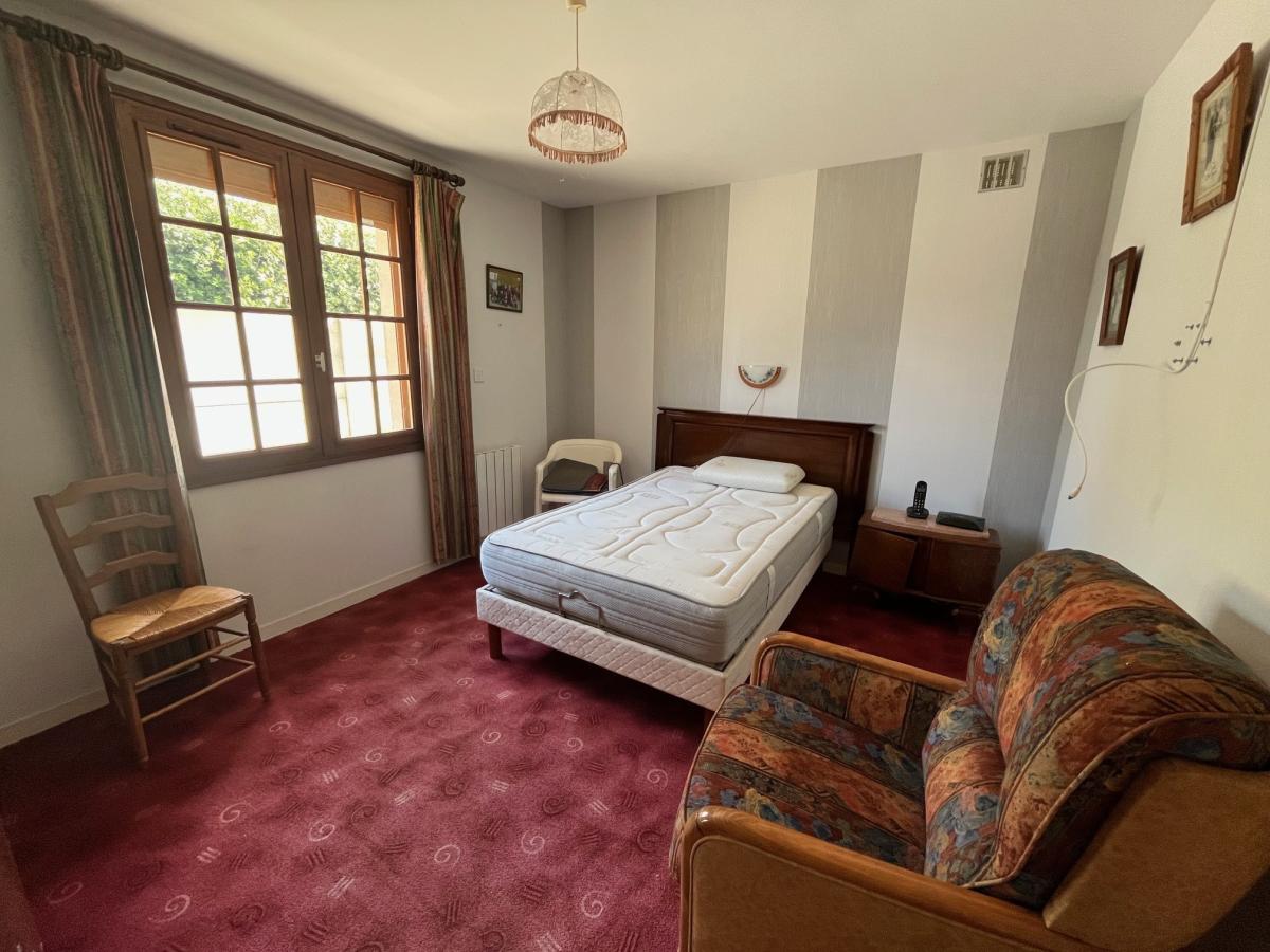Entrée, séjour avec cheminée insert et cuisine ouverte 38 m², deux chambres 11 m² et 13 m², salle de bains (baignoire et douche), wc,