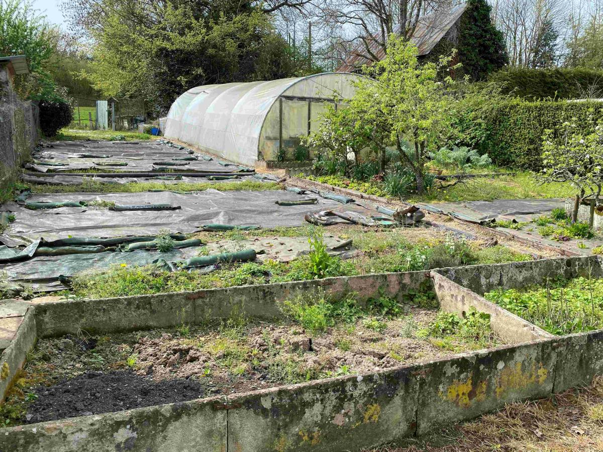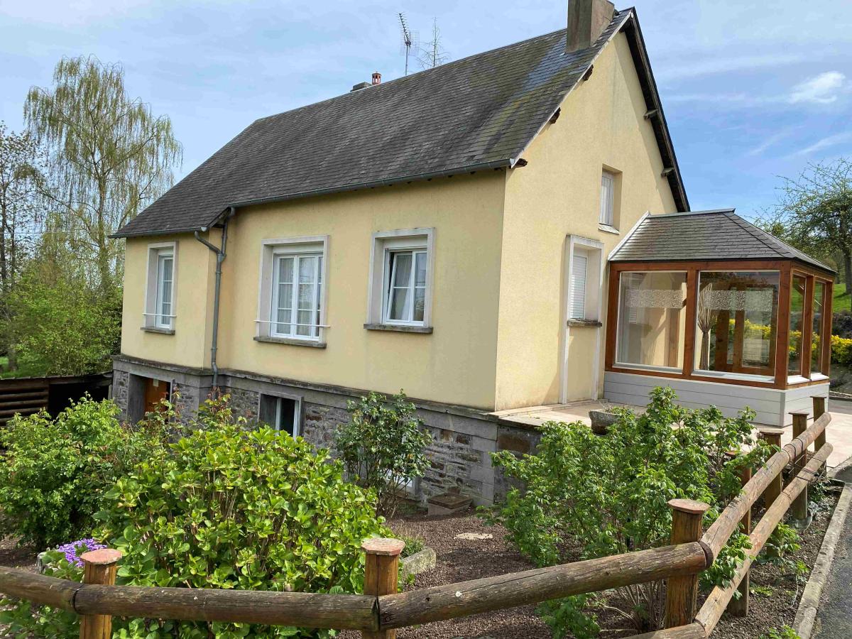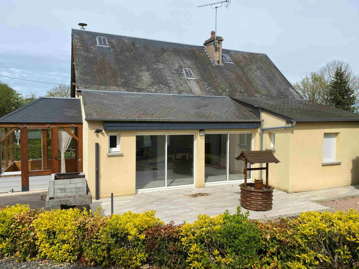 Proche PONT D'OUILLY, MENIL HUBERT: Maison avec 2ha 30 de terrain clos et arboré avec puits, comprenant de plain pied, séjour 41 m² avec cheminée et cuisine aménagée, terrasse, véranda, débarras, deux chambres, salle de bains avec douche à l'Italienne et baignoire, wc, grenier sur l'ensemble, sous sol 65m², garage 55 m², cave 26m², hangar 120 m², chenil, terrain clos et arboré, chauffage bois et fioul, double vitrage, prix 290 500 € honoraires de négociation à la charge du vendeur