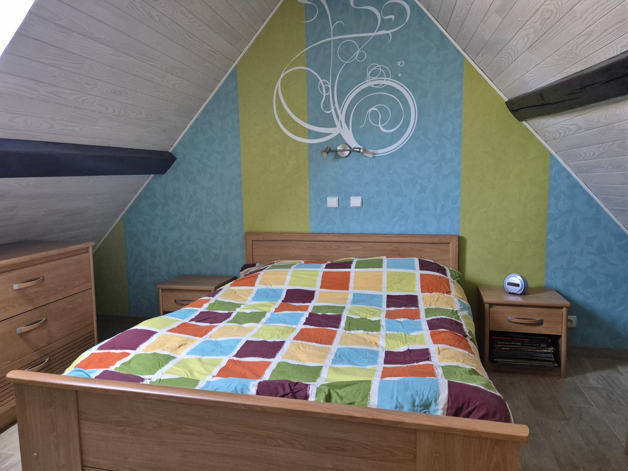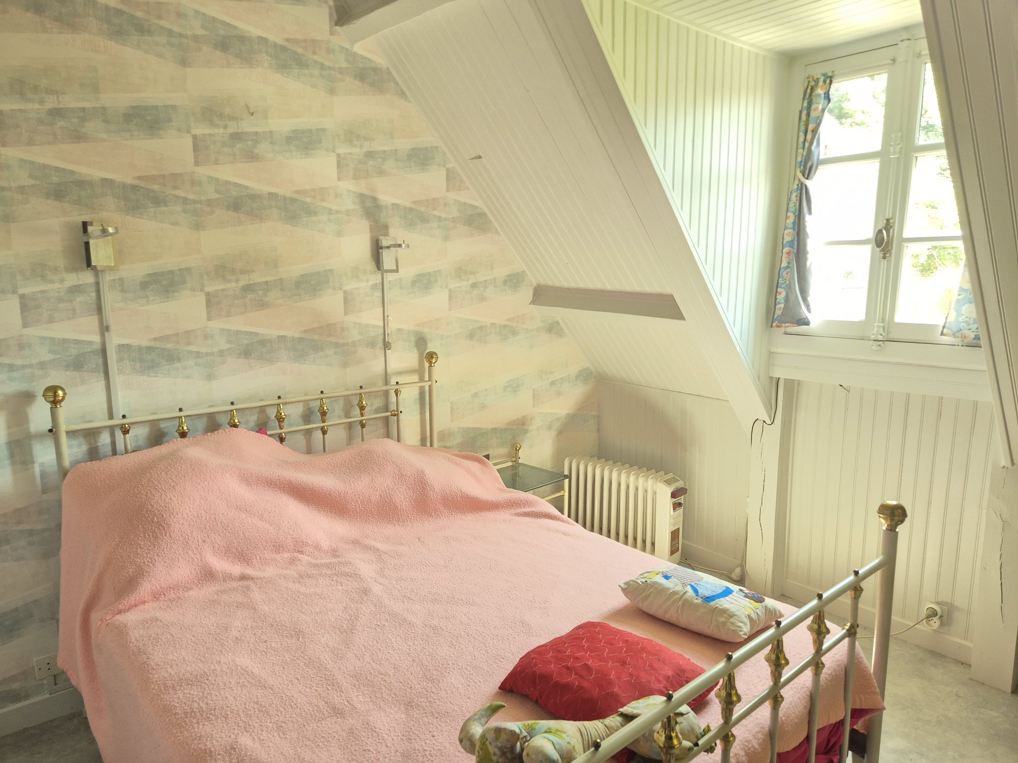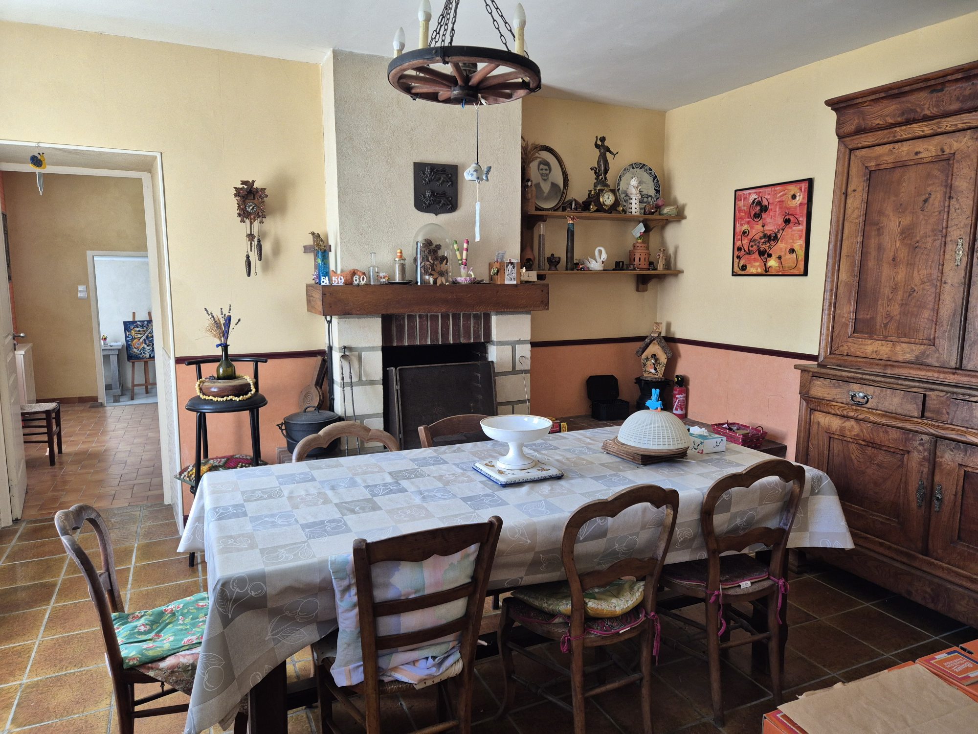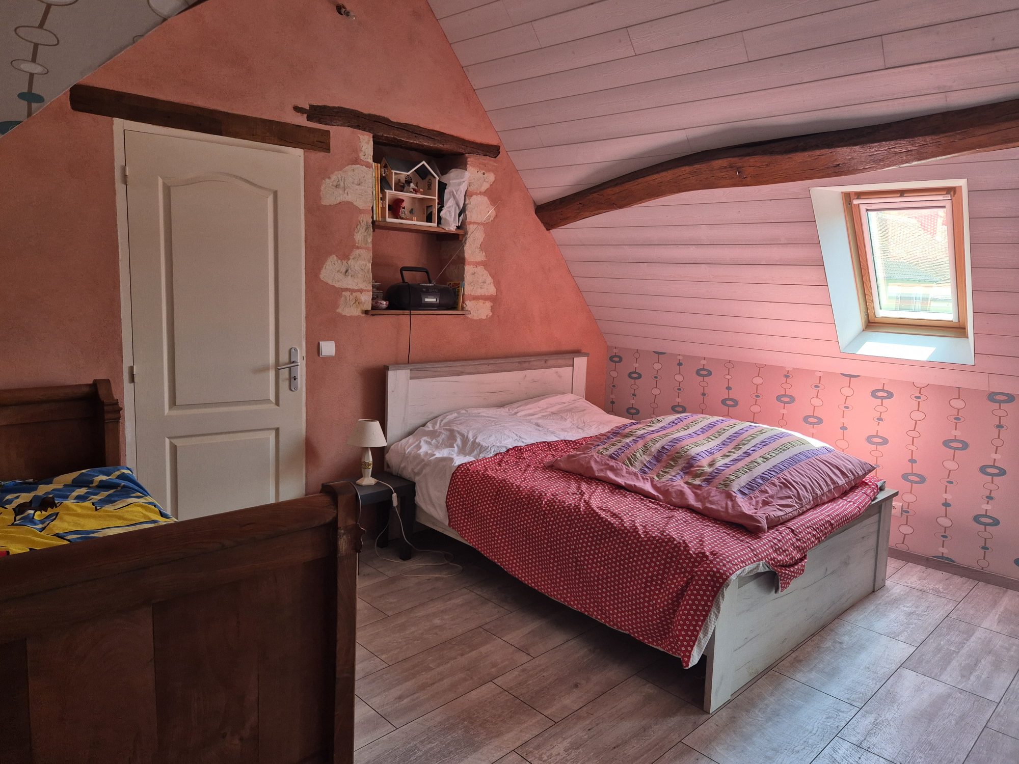 La première maison comprend au rez-de-chaussée : une cuisine, une buanderie, une salle d'eau avec WC et un séjour avec cheminée communicant avec la seconde maison. A l'étage : un palier et deux chambres.