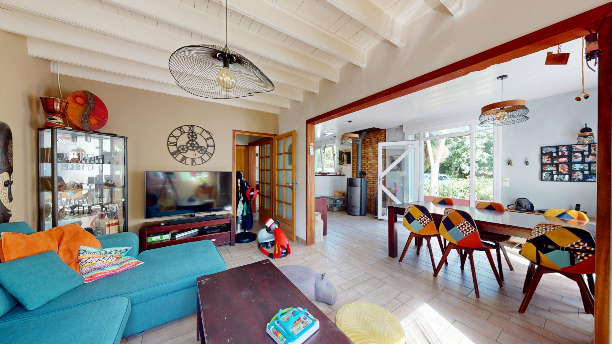 - au rez-de-chaussée : séjour avec poêle à bois, salon, cuisine ouverte, bureau, WC, débarras ;