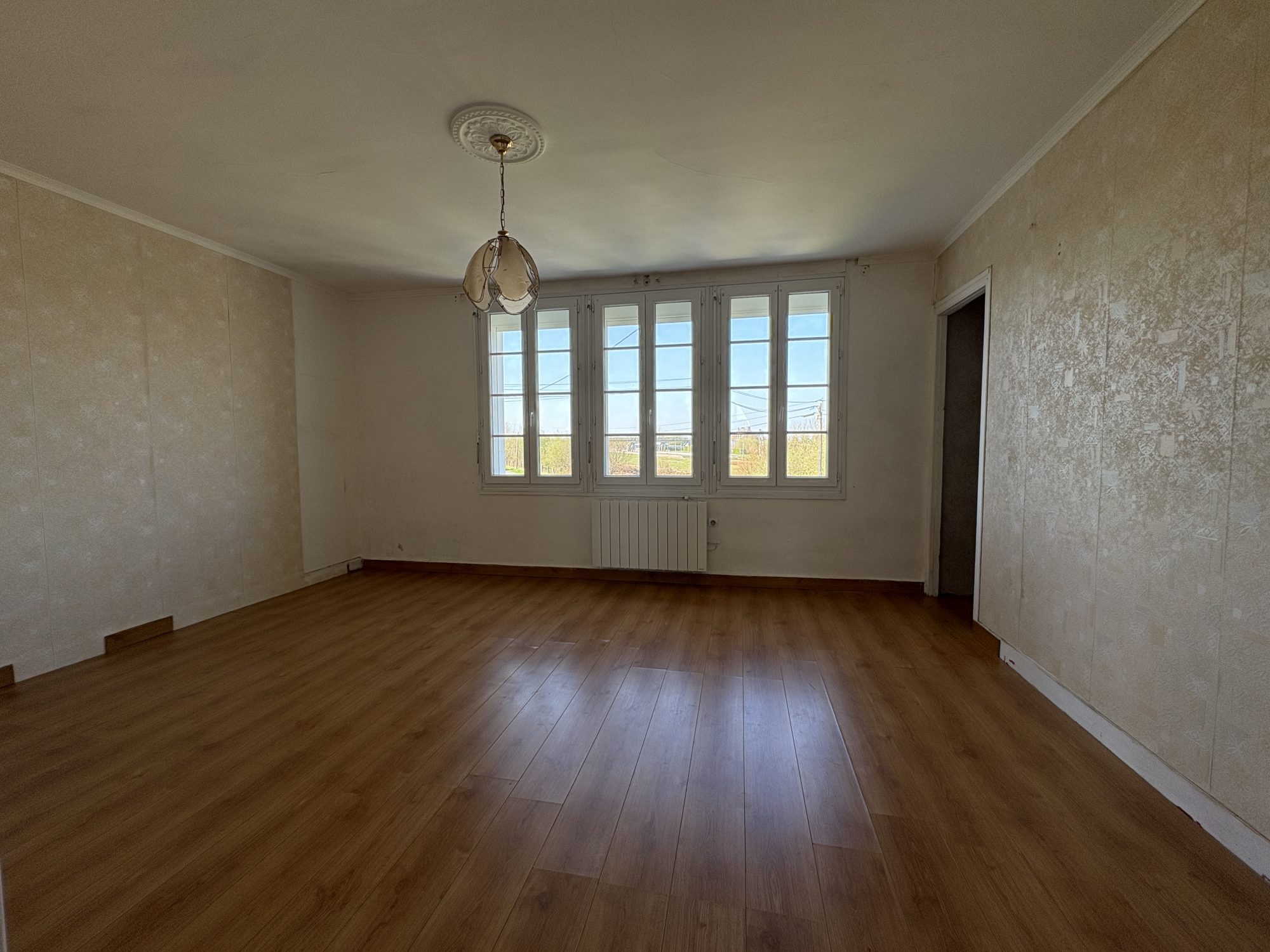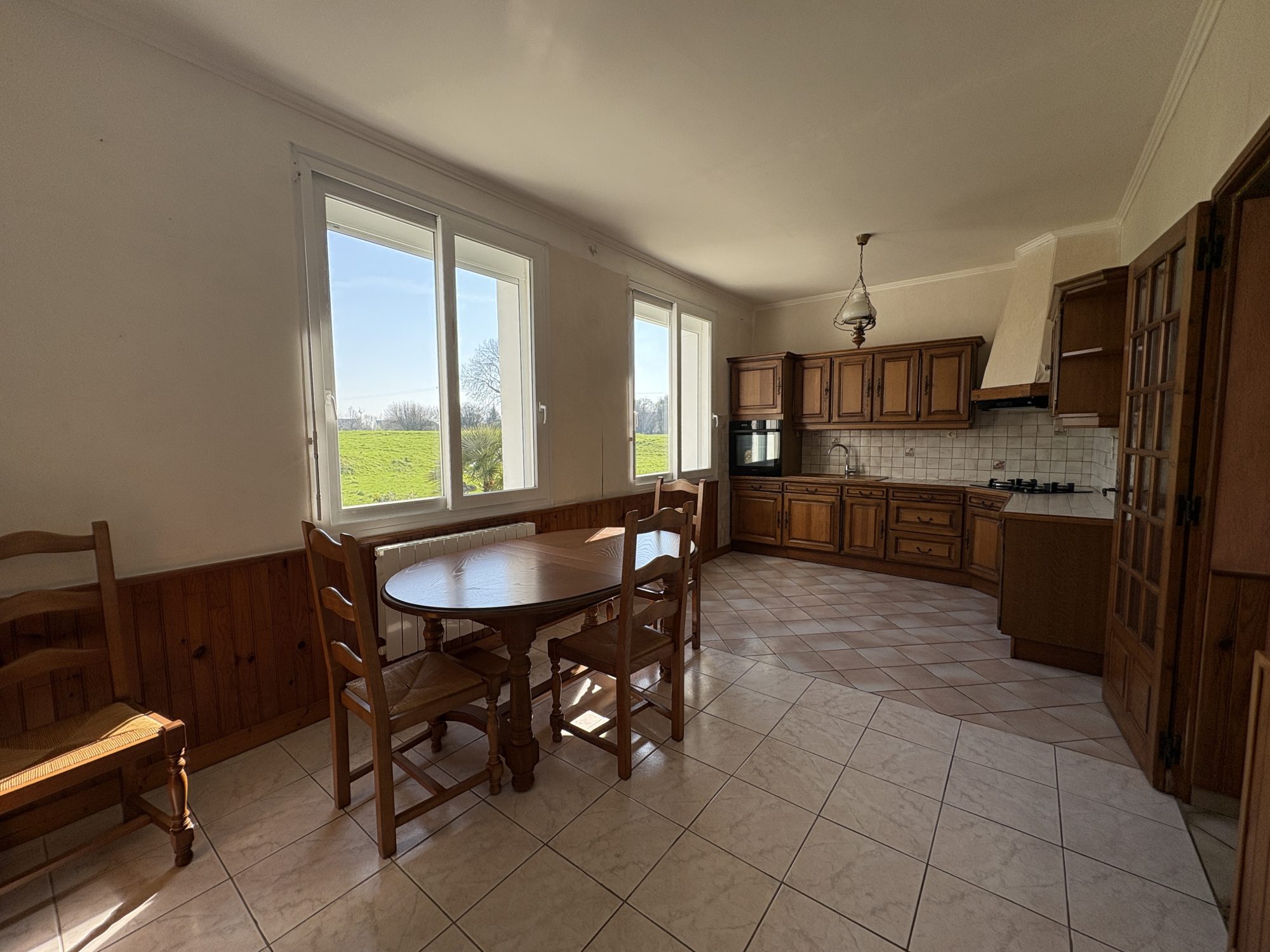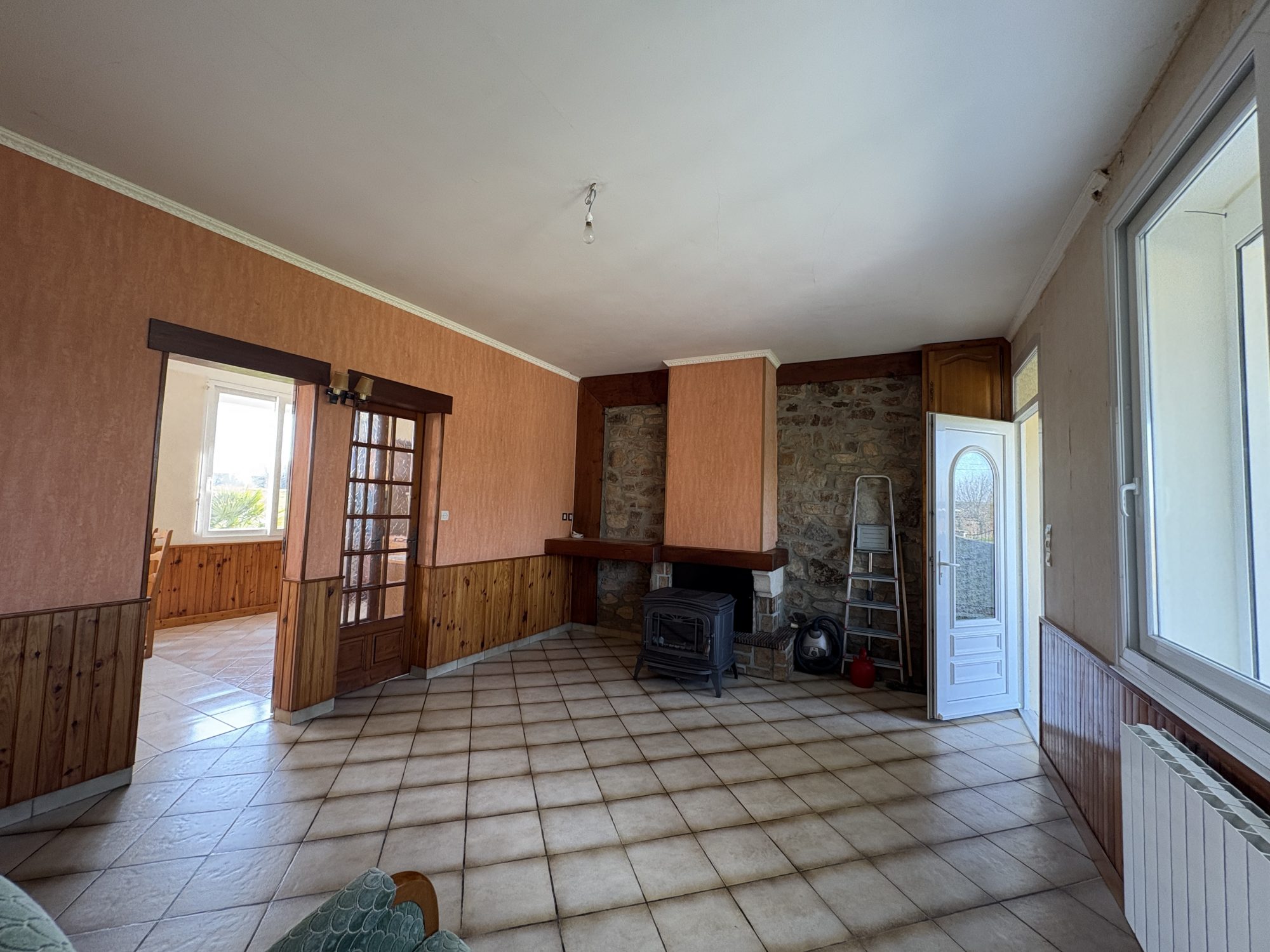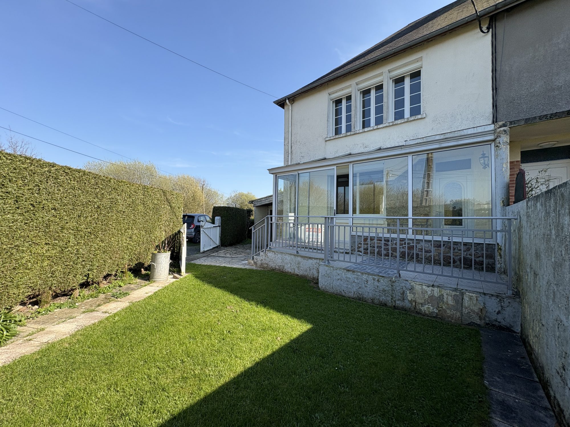 Maison mitoyenne d'un côté comprenant au rez de chaussée ; une véranda en guise d'entrée, une pièce de vie lumineuse avec un poêle à bois, une cuisine équipée et aménagée.