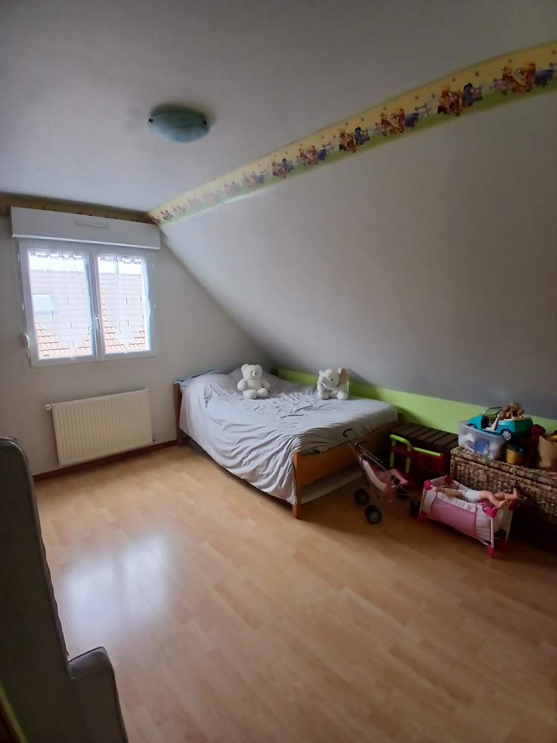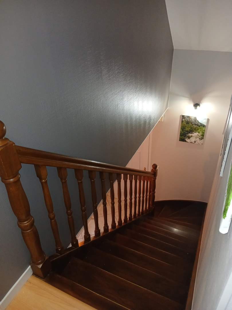 A l’étage : couloir desservant trois chambres, salle de bains avec wc, bureau.