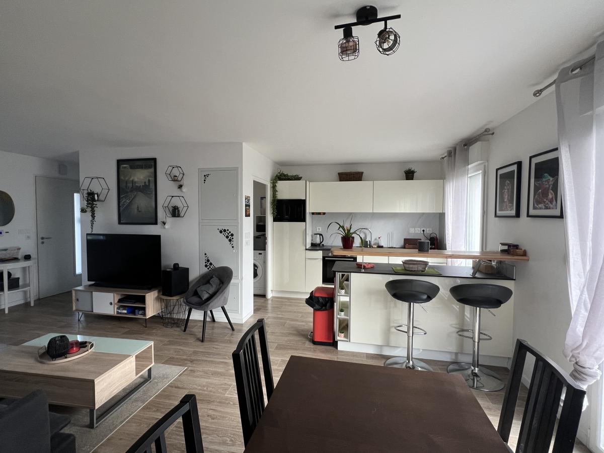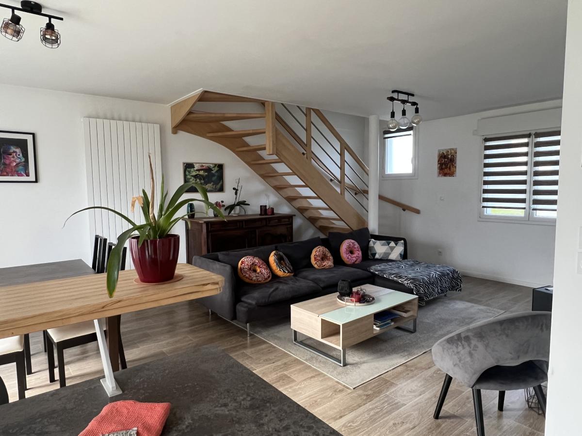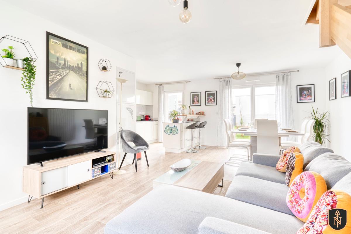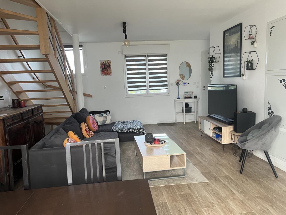 CAMBES EN PLAINE - CAEN NORD bus de ville, ravissante maison 2019 mitoyenne d'un côté, comprenant entrée avec placards, cuisine aménagée ouverte sur séjour salon 35 m2, 3 chambres, salle de bains avec wc, buanderie, wc avec lave mains. Garage attenant. Terrain clos de 240 m2. Chauffage gaz de ville. Parfait état général. DPE : C