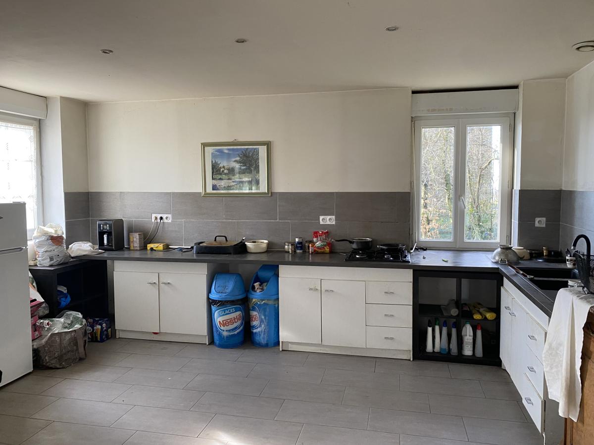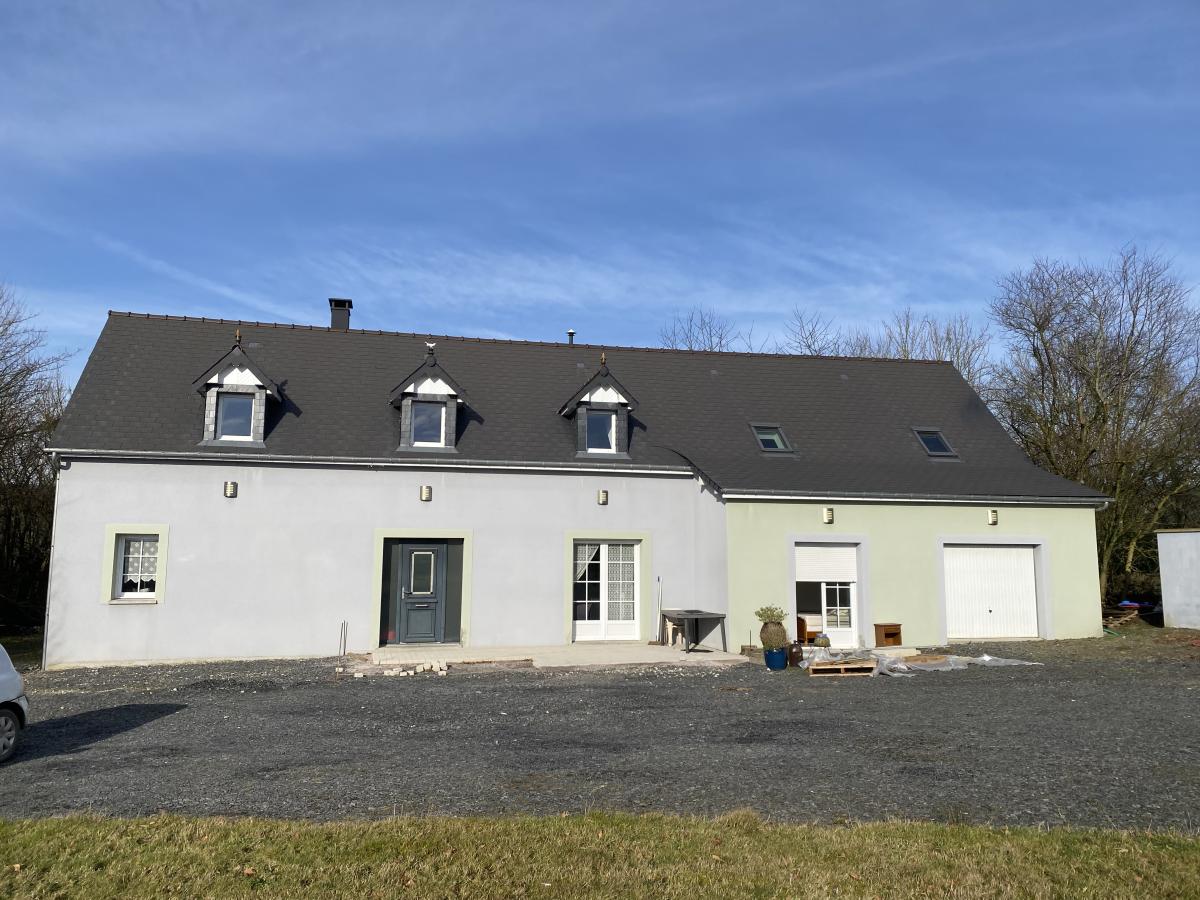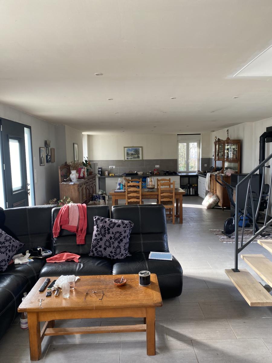 - au rez-de-chaussée : une grande pièce de vie de 55 m² avec poêle à granulés, un dégagement, deux chambres, une salle d'eau, un W.C., un garage avec grenier aménageable sur le dessus,