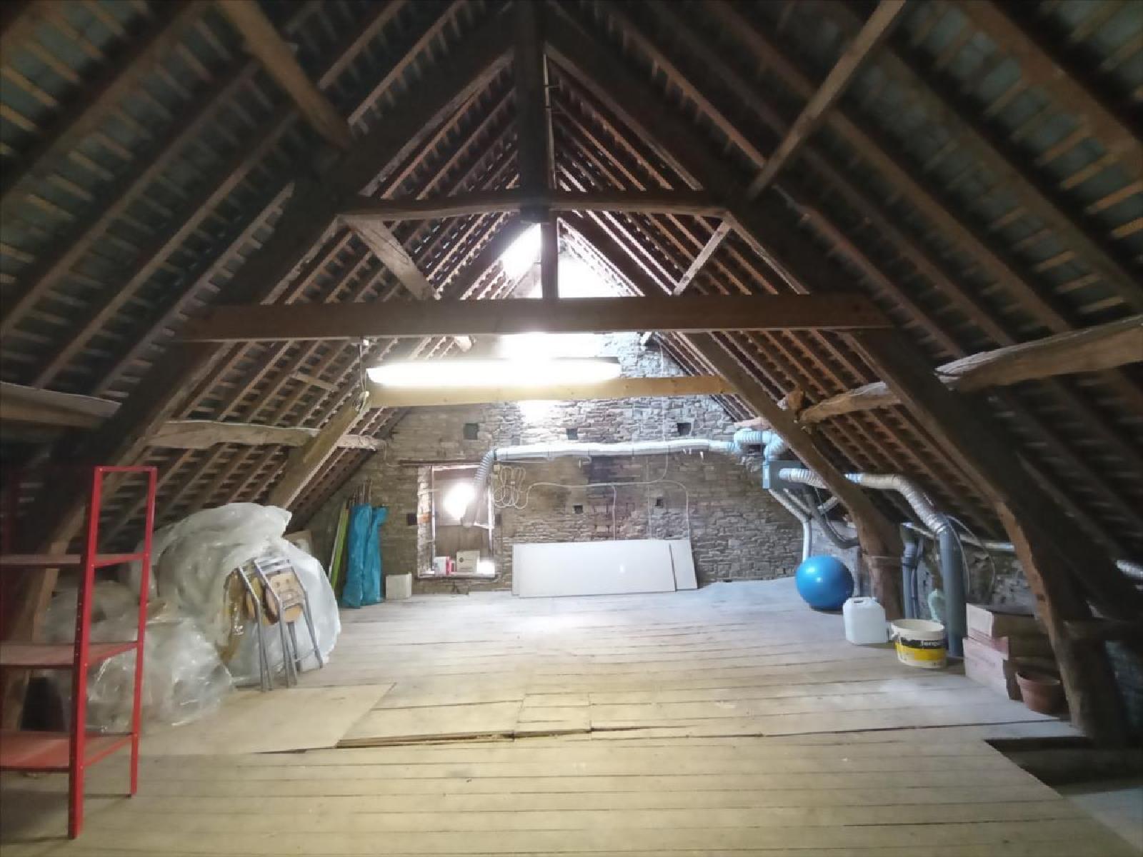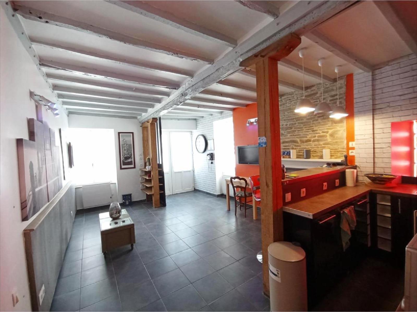 Maison de bourg mitoyenne par deux côtés et comprenant : Au rez-de-chaussée : séjour sur cuisine ouverte aménagée, dégagement, WC ; Au premier étage : palier, deux chambres, salle de bains et douche, WC ; Grenier au-dessus. Garage attenant. Pas de terrain. Accès par cour commune. Droit au puits. Logement à consommation énergétique excessive. Les informations sur les risques auxquels ce bien est exposé sont disponibles sur le site Géorisques : www. georisques. gouv. fr