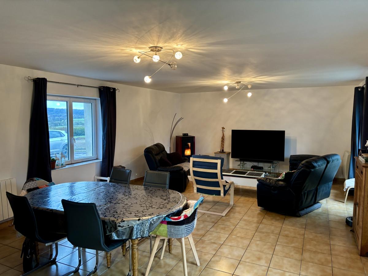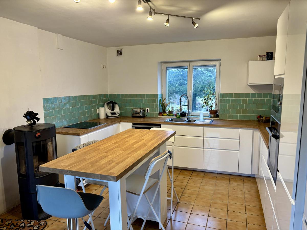- Au rez-de-chaussée : entrée, cuisine aménagée et semi-équipée avec poêle à bois, vaste pièce de vie avec poêle à granulés, salle d'eau, WC et cellier/buanderie.