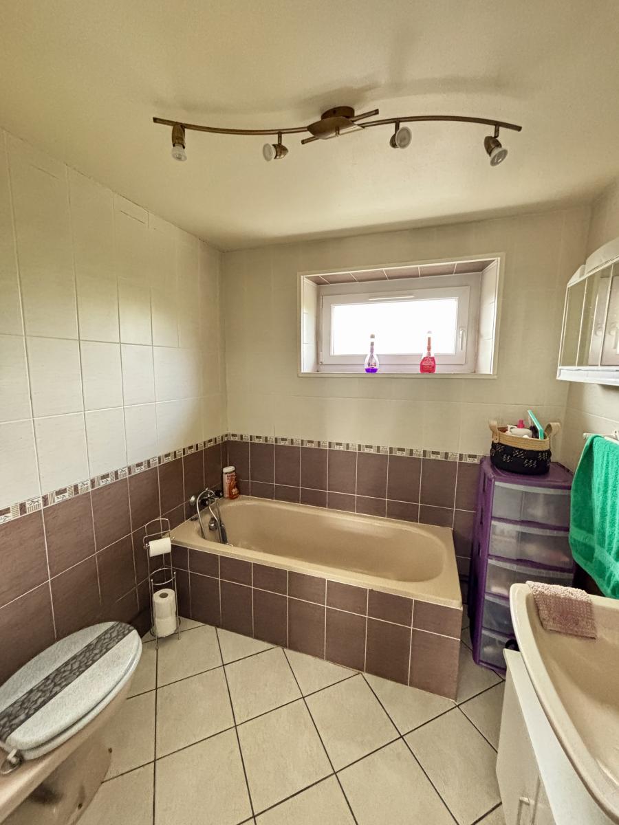 – Au rez-de-chaussée : pièce de vie, salon, cuisine, salle de bains avec WC,