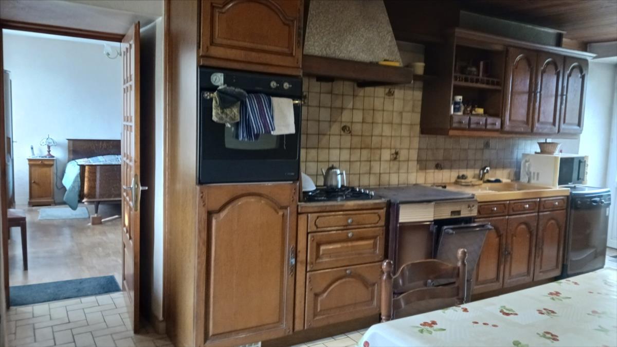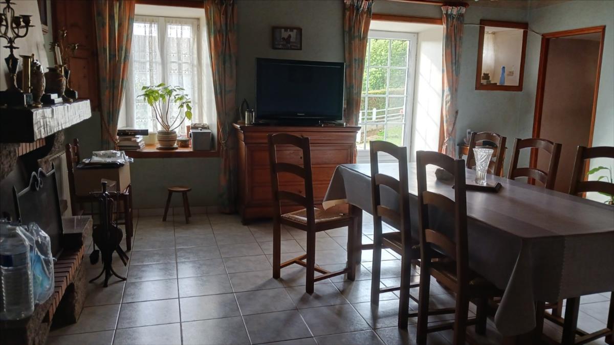 - au rez-de-chaussée : cuisine avec fourneau à bois, salon-séjour avec cheminée foyer ouvert, deux chambres communicantes, vestibule avec lavabo desservant des WC.