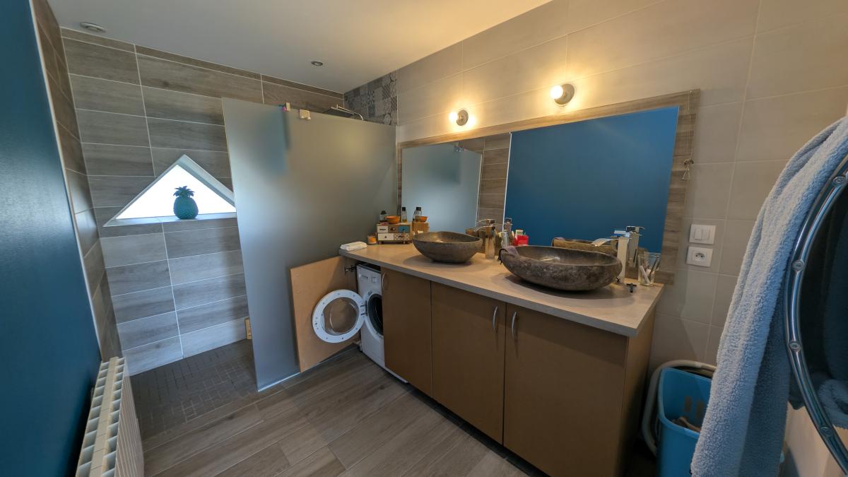 au rez-de-chaussée : séjour avec poêle à bois, cuisine ouverte aménagée/équipée, dégagement, wc, salle d'eau, garage.