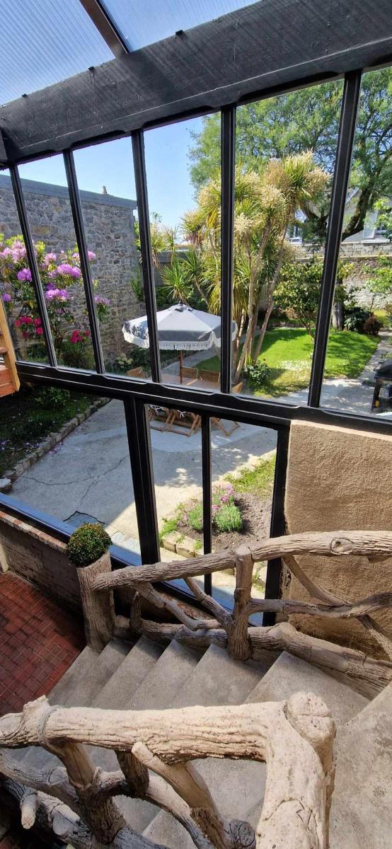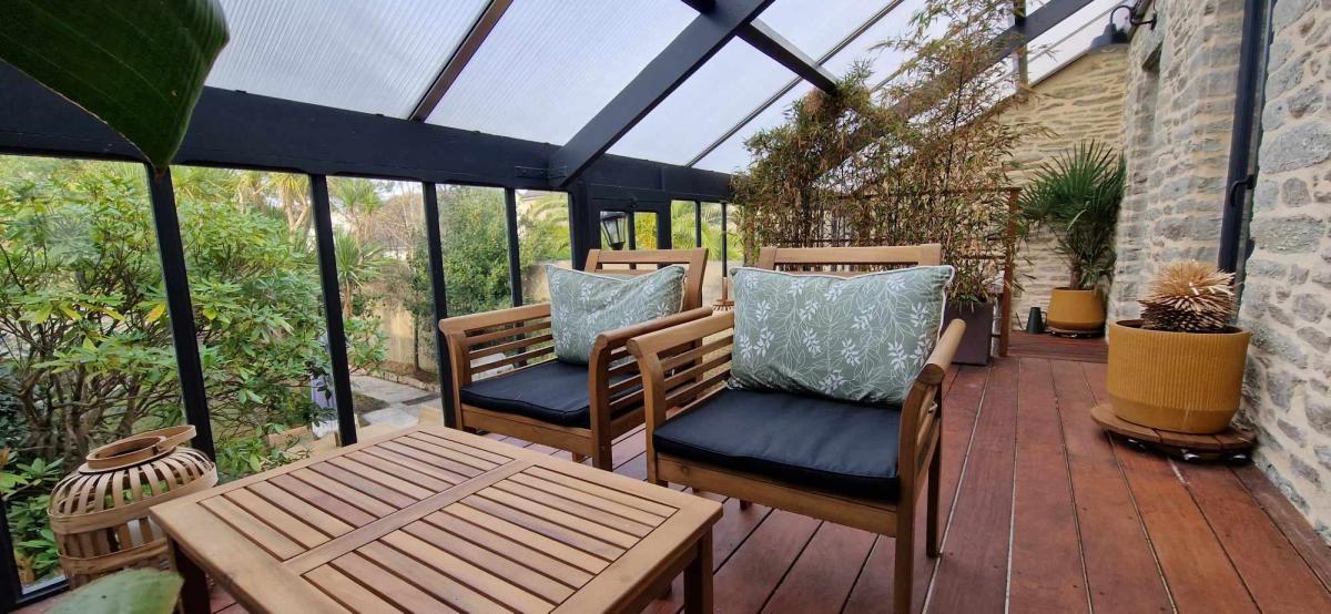 Deux terrasses couvertes, l'une au rez-de-chaussée style patio donnant sur un jardin clos, l'autre au premier étage en bois exotique faisant office de jardin d'hiver.