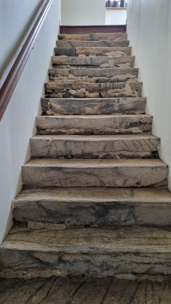 Escalier en pierre menant à l'étage : une grande chambre, un bureau.