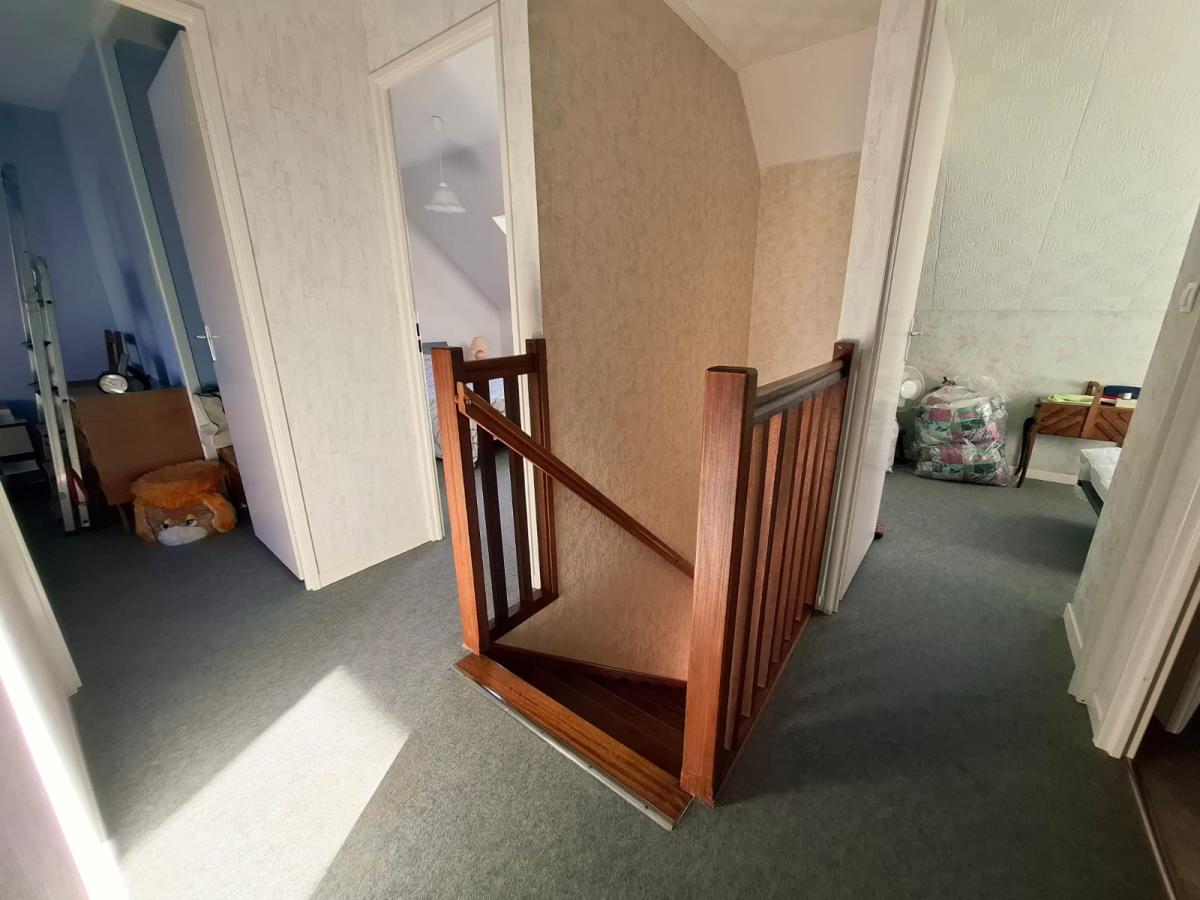 A l'étage : palier, 3 chambres avec placards, bureau et salle de bains (meuble vasque/baignoire et WC sanibroyeur)