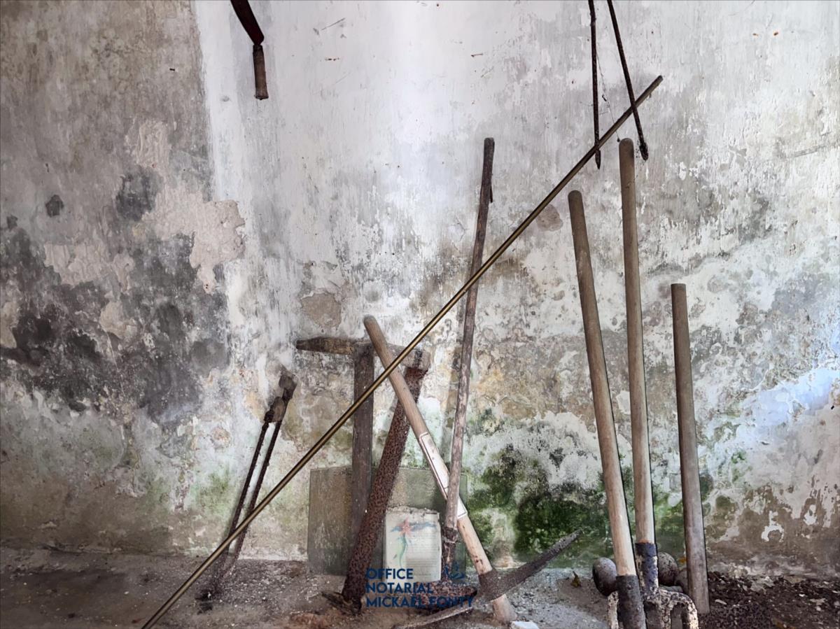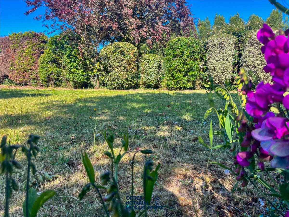 l’extérieur de la maison et un garage. Grand jardin tout autour.