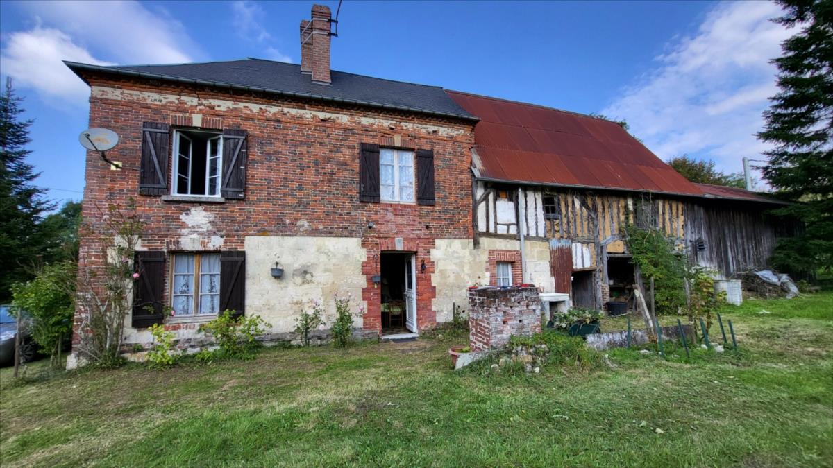 En campagne avec vue dégagée, maison en brique à rénover comprenant entrée avec escalier, cuisine, séjour, salle d'eau, wc; au 1er étage : deux chambres; au 2ème étage : grenier aménageable; dépendance attenante en colombage à usage de cellier et atelier, l'ensemble sur 1175 m².