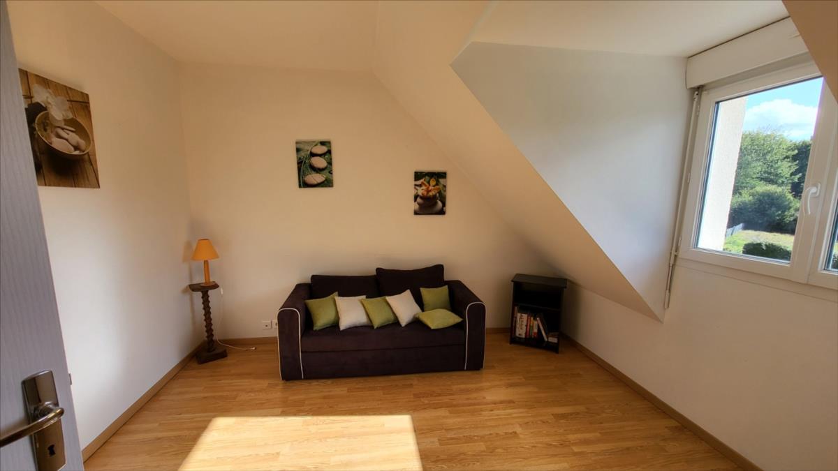 En campagne, mais non isolée, maison bien entretenue comprenant séjour ouvert sur cuisine aménagée et équipée, couloir desservant deux chambres, bureau, salle de bains et wc ; à l'étage : palier et couloir desservant trois chambres dont une très grande, salle de douche avec wc. Garage et buanderie avec pompe à chaleur récente; Chauffage par géothermie. Terrain avec plan d'eau et terrasse.