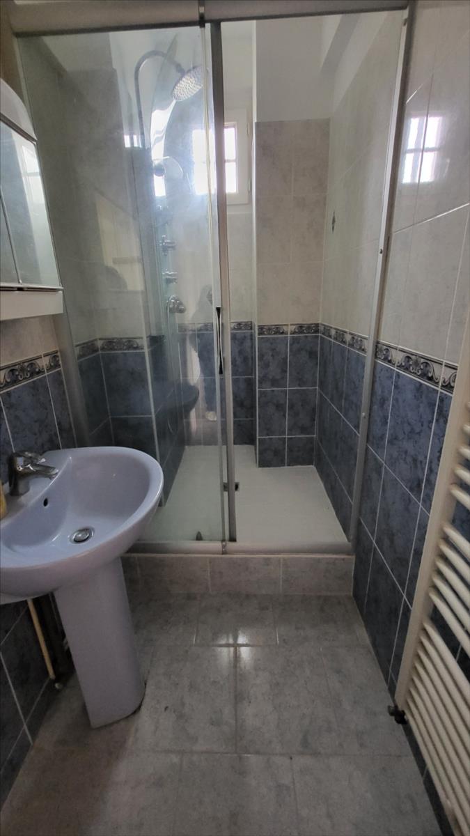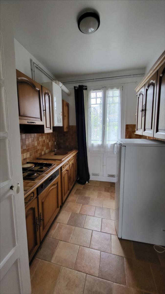 Appartement de 56 m² au 1er étage dans immeuble de 6 logements : séjour avec cheminée, cuisine aménagée avec chaudière gaz, salle de douche carrelée, wc, séparés, deux chambres parquetées. Cave et garage. Petit terrain à l'arrière.