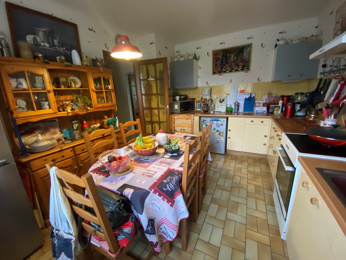 - Cuisine (3,84 m x 3,065 m) avec fenêtre en bois donnant sur l’avant de la maison, murs partiellement carrelés, carrelage au sol, radiateur, les meubles de cuisine demeurent avec la cuisinière et la hotte.