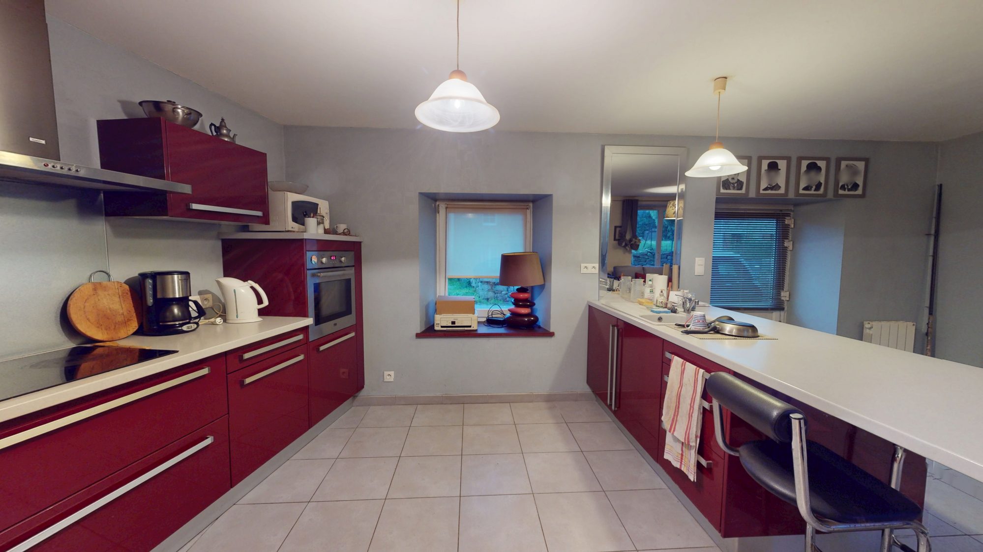 - Au rez-de-chaussée : Séjour/salon avec poêle à bois et cuisine ouverte, buanderie et WC.