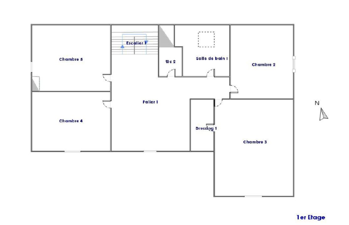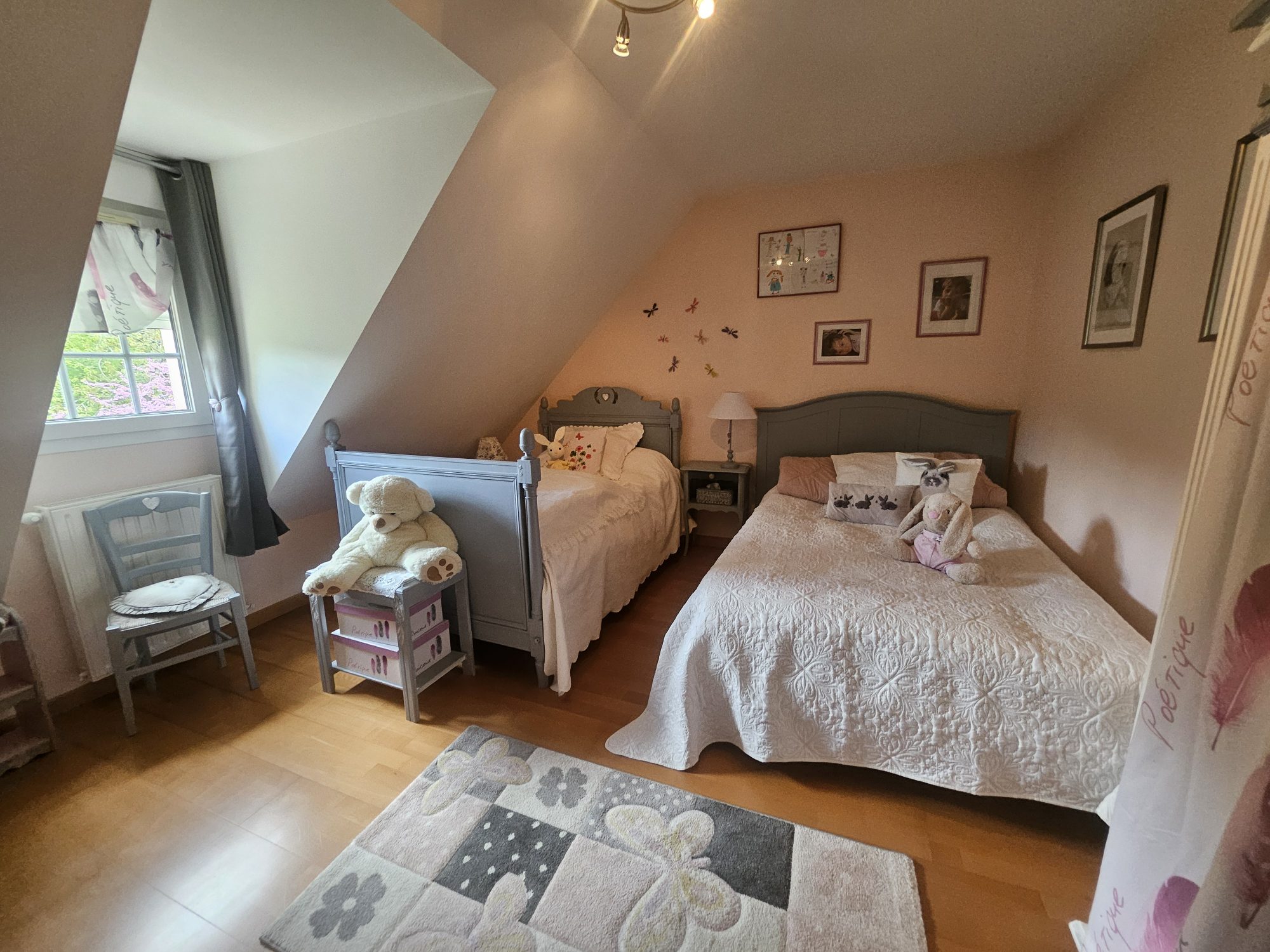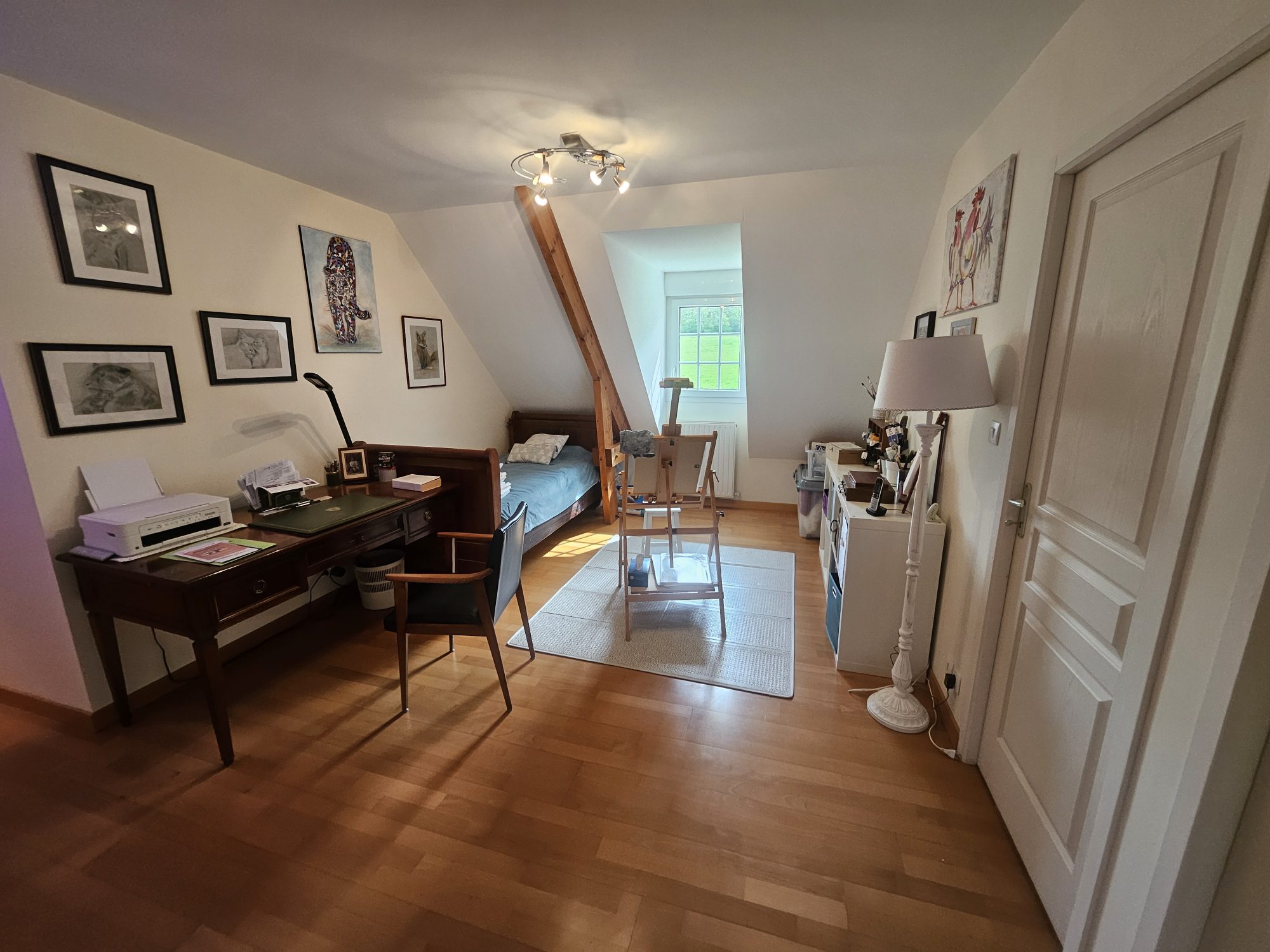 A l'étage : un palier pouvant faire office de bureau offre quatre chambres dont une avec dressing, WC séparé et une salle de bains-douche.